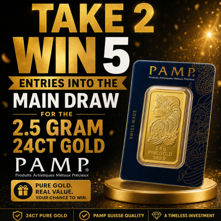 WIN 5 ENTRIES INTO THE MAIN DRAW FOR THE 2.5 Gram 24ct GOLD PAMP BAR