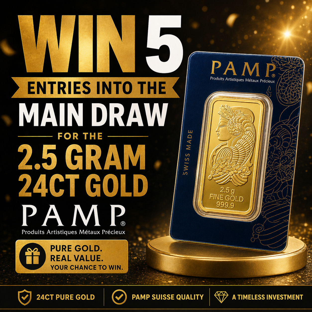 WIN 5 ENTRIES INTO THE MAIN DRAW FOR THE 2.5 Gram 24ct GOLD PAMP BAR