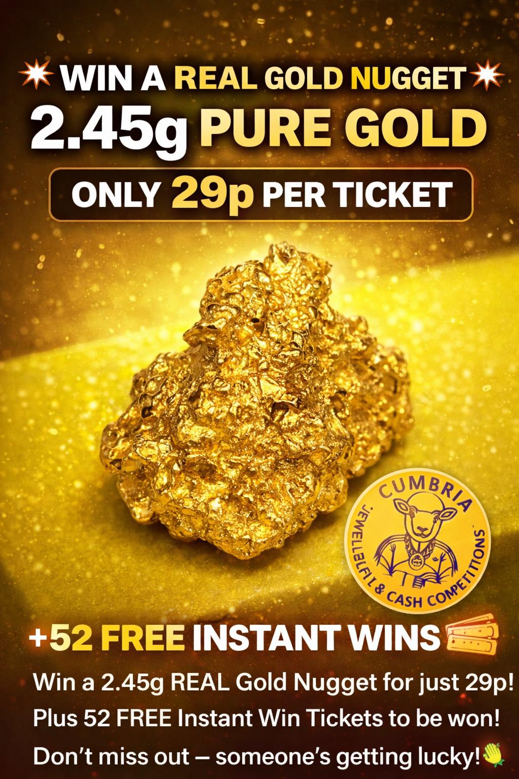 💥 Win a 2.45g REAL Pure Gold Nugget 💥 Here’s your chance to own a genuine raw gold nugget, weighing in at 2.45 grams of pure natural gold 🪙✨ This isn’t a bar or replica — this is real, naturally formed gold, making it a unique and valuable piece for collectors, investors, or anyone who loves gold. 🔥 Competition Details: 🎟️ Only 29p per ticket 🪙 2.45g Real Gold Nugget 📏 Approx 14.1mm size (see images for proof) 🎯 52 FREE Instant Win Tickets to be won along the way! ⚡ Instant Wins Included: There are 52 chances to win FREE tickets instantly, meaning you could win before the main draw even happens! 🎉 The more tickets you have, the better your chances of: Hitting an instant win 🎟️ Landing the main gold nugget prize 🏆 🛡️ Why Enter? ✔️ Real item – exactly as shown in photos ✔️ Low-cost entry for high-value prize ✔️ Instant wins give extra chances to win ✔️ Fair and transparent draw ⏳ Don’t Miss Out With tickets at just 29p, this one won’t hang around for long… 👉 Secure your numbers now and take your shot at winning real gold! 🍀 Stick this at the bottom: 💬 Drawn live on Facebook once all tickets are sold or timer ends.